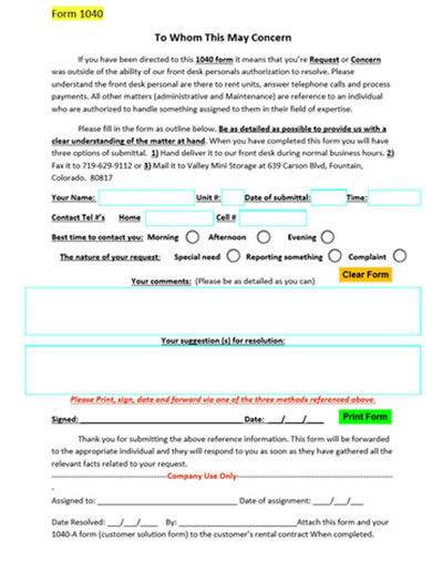At great deal of work has been put into the reporting format on this 1040 form. In any environment where people inter act, there is a wide variety of items or issues that can arise in the normal course of daily life. The 1040 has been developed to allow you to communicate with our staff 24 hours a day, 7 days a week. Simply fill out this form and forward it to our office via one of the three (3) delivery options listed on the form. All the areas of entry are auto fill so its just as easy as 1-2-3.